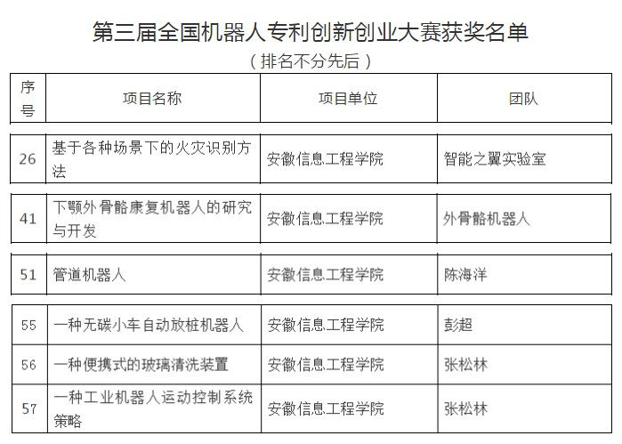 本网讯 11月29日,为加快芜湖国家机器人产业集聚区的发展,鼓励机器人领域拥有自主知识产权的高端人才或人才团队创新创业,加速创新资源集聚,安徽省知识产权局和芜湖市人民政府决定共同举办第三届全国机器人专利创新创业大赛(以下简称大赛)。我校共六支师生队伍顺利通过预赛,喜获全国优秀奖6项,并且我校还是此次大赛中是全国唯一一所荣获“组织推荐奖”的独立院校,一共获得该殊荣的还有武汉大学、吉林大学、合肥工业大学、哈工大工程技术研究院等。揭开了我校在此类国家级大赛中获奖从无到有的突破。