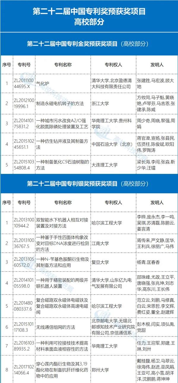 具体来看,清华大学“气化炉”,浙江大学“制造永磁电机转子的方法”,华南理工大学“一种城市污水改良A2/O强化脱氮除磷处理装置及工艺”,中国石油大学(北京)“一种仿生钻井液及其制备方法”,大连理工大学“一种制备氢化C9石油树脂的方法”,拟获评中国专利金奖预获奖项目。