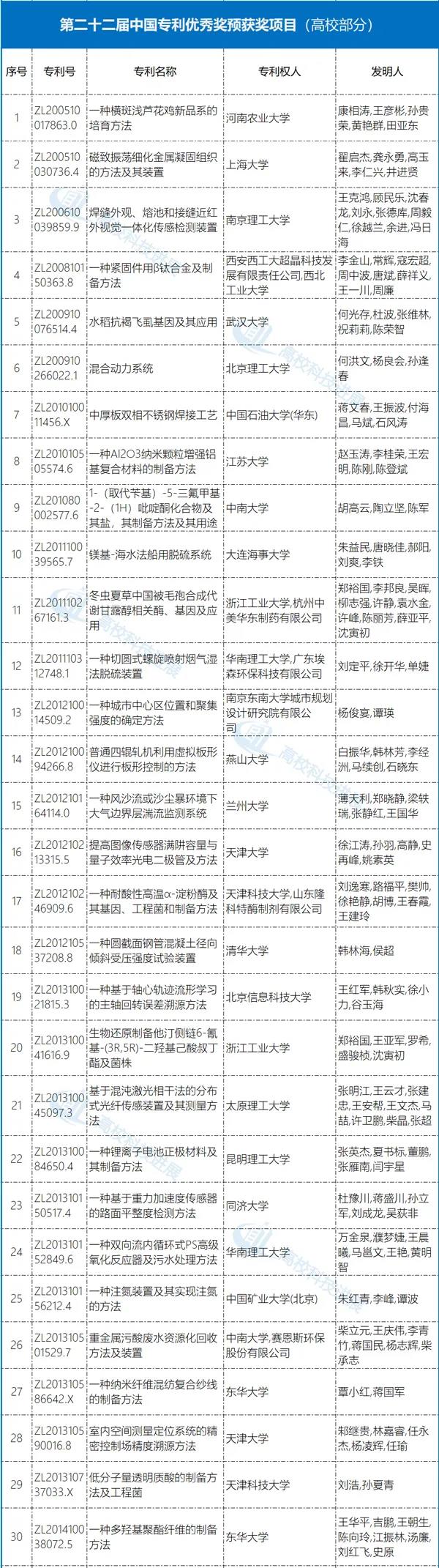 河南农业大学“一种横斑浅芦花鸡新品系的培育方法”,上海大学“磁致振荡细化金属凝固组织的方法及其装置”,南京理工大学“焊缝外观、熔池和接缝近红外视觉一体化传感检测装置”,武汉大学“水稻抗褐飞虱基因及其应用”,北京理工大学“混合动力系统”,中国石油大学(华东)“中厚板双相不锈钢焊接工艺”等等,拟获评中国专利优秀奖预获奖项目。