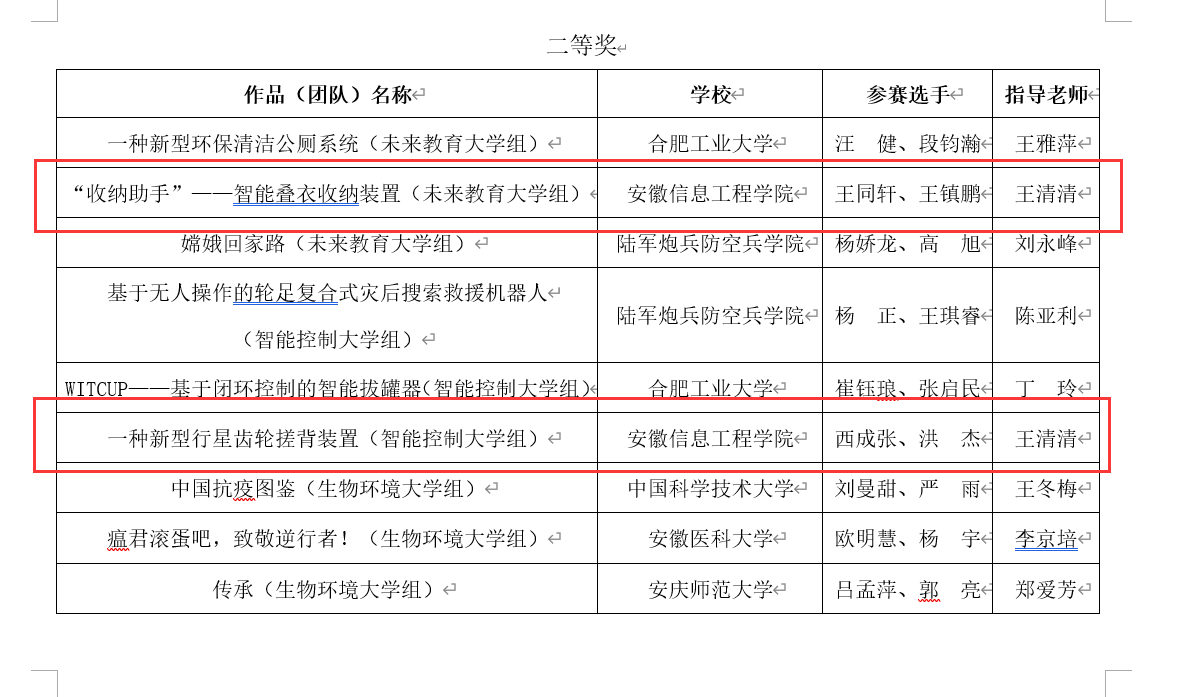 5月9日,由安徽省科协主办,安徽省科技馆承办的第七届全国青年科普创新实验暨作品大赛安徽赛区复赛圆满落下帷幕。其中,我校机械工程学院王同轩团队的作品《“收纳助手”——智能叠衣收纳装置》、机械工程学院西成张团队的作品《一种新型行星齿轮搓背装置》获得安徽省二等奖,机械工程学院冯洪团队的作品《一种新型的智能化物流终端处理系统》、电气与电子工程学院刘祖颀团队的作品《“轻而易举”——半自主载物爬楼功能运输车》、电气与电子工程学院洪炜团队的作品《新型智能化路灯节能系统》获得安徽省三等奖。