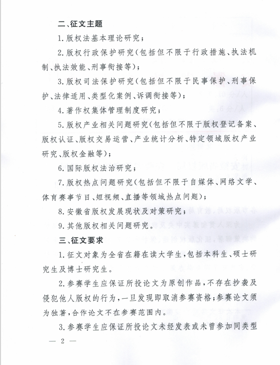 为深入贯彻落实中央及我省关于全面加强知识产权保护的决策部署,强化版权创造、保护和运用,提高青年大学生创新能力,营造全社会尊重知识、尊重版权的良好氛围,省版权局、省教育厅联合举办第二届安徽省大学生版权征文活动。