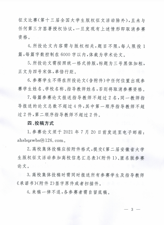2.高校集体投稿应按附件格式,提交《第二届安徽省大学生版权征文活动参加高校信息汇总表》(附件1)、匿名版参赛论文。