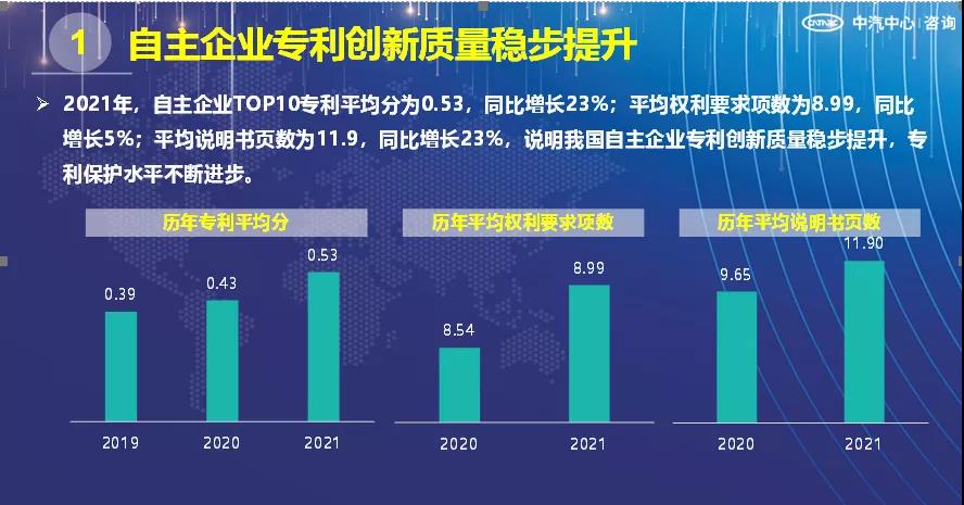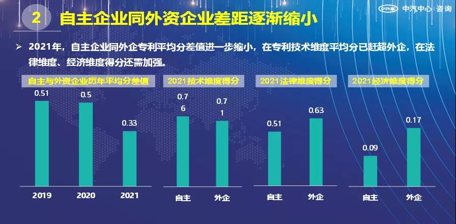 2021年,自主企业专利平均分、专利平均权利要求项数、专利平均说明书页数等各项专利指标较往年均有提升,同外企专利平均分差值进一步缩小,在专利技术维度平均分已赶超外企,在法律维度、经济维度得分还需加强。