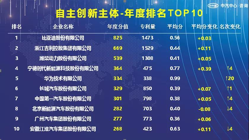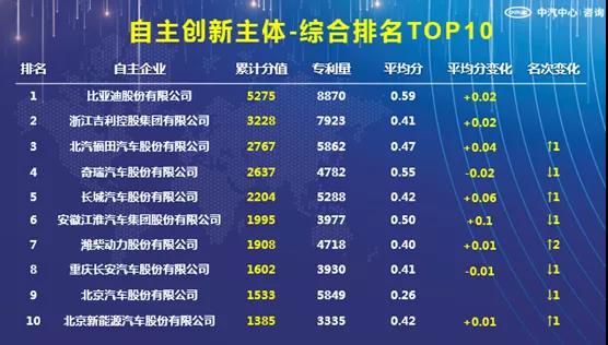 1、自主创新主体综合排名TOP10中,比亚迪、吉利蝉联榜单前两位,其余创新主体名次均有变化,但名次波动较小。
