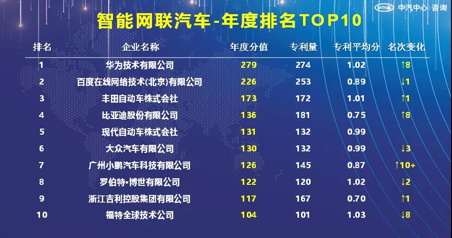 6、智能网联汽车年度排名TOP10中,华为、百度占据前两位,比亚迪、小鹏、吉利整车企业均有入围,其中小鹏名次提升明显。