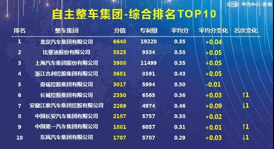 3、自主整车集团综合排名中,各整车集团名次变化较小,TOP5集团名次无变化。各整车集团专利平均分普遍增长,专利质量有所提升。