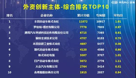 4、外资创新主体综合排名中,丰田自动车株式会社排名第一,其有效专利量和专利平均分均位居前列,技术创新实力最强,供应商博世、电装及舍弗勒入围TOP10。