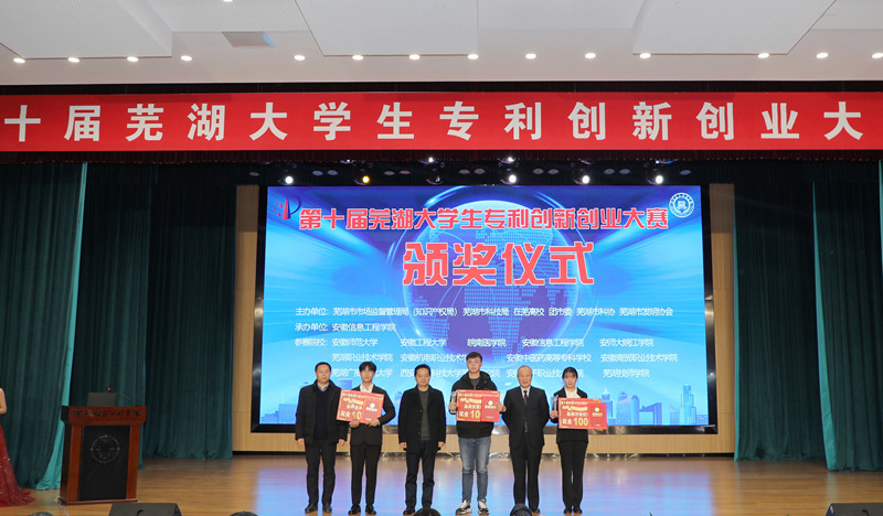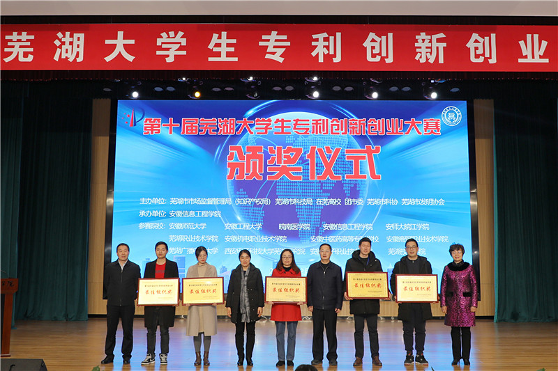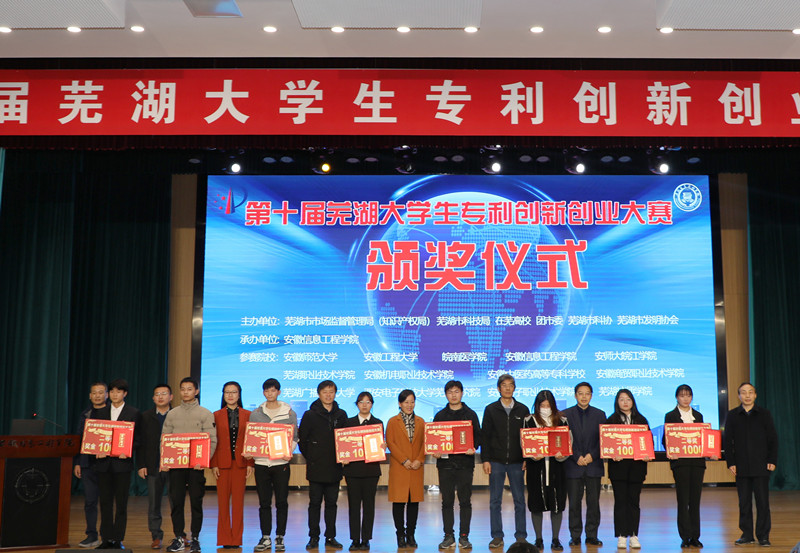 安徽省市场监督管理局副局长、知识产权局局长程胤,中共芜湖市委常委、宣传部部长韦秀芳,芜湖市政协副主席陈怡,安徽省市场监督管理局(知识产权局)知识产权运用促进处处长操诚、知识产权公共服务处处长孙杰,知识产权保护处处长何东奇,芜湖市市场监督管理局(知识产权局)党委书记、局长曹德伟,副局长朱寿发,芜湖市科技局副局长辛立民等领导受邀上台为获奖学子颁奖。