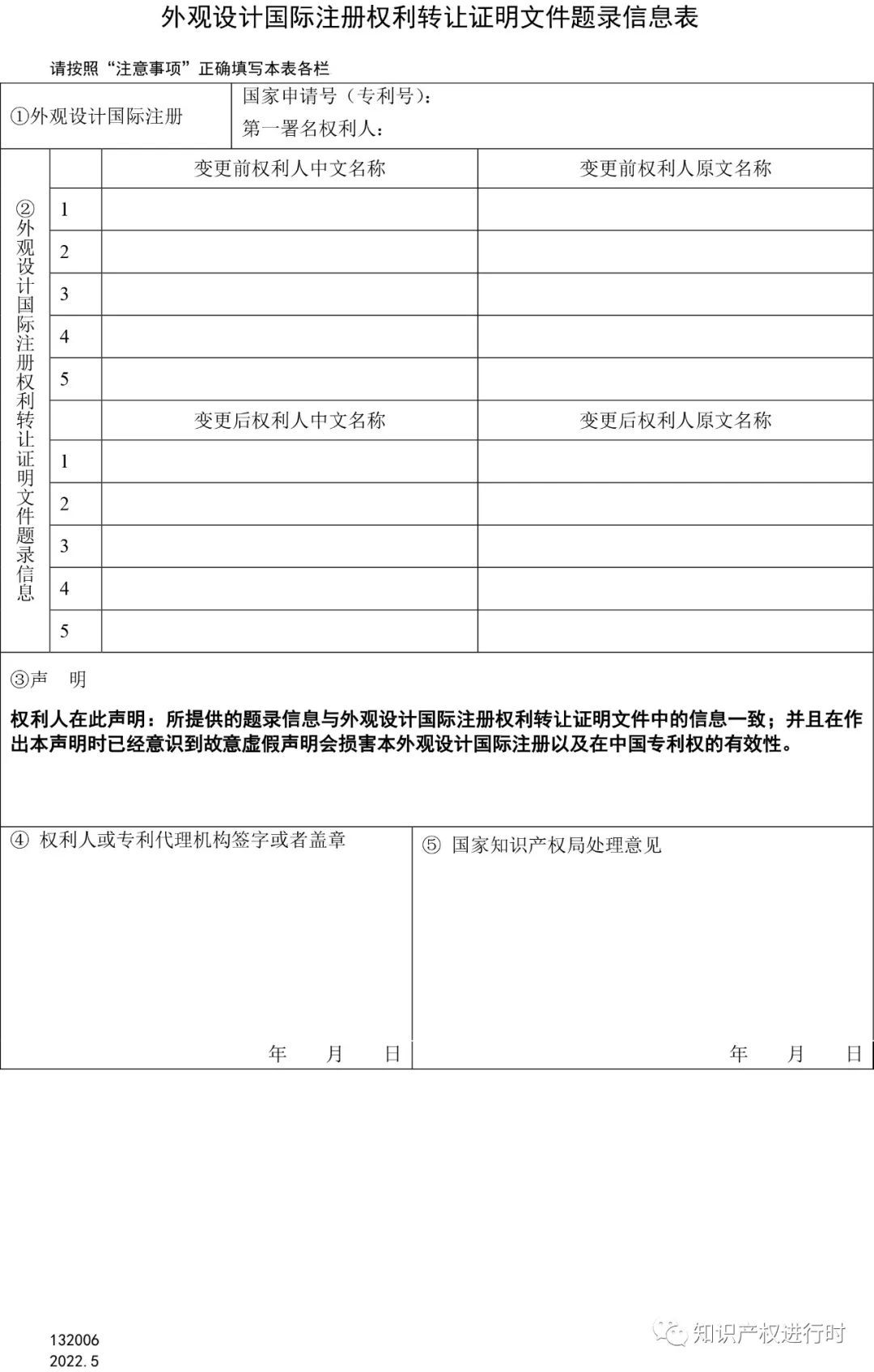外观设计国际申请相关请求类表格清单及样式见附件。申请人可通过访问国家知识产权局网站(http://www.cnipa.gov.cn)“政务服务”专利专栏下的“表格下载”栏目下载使用。