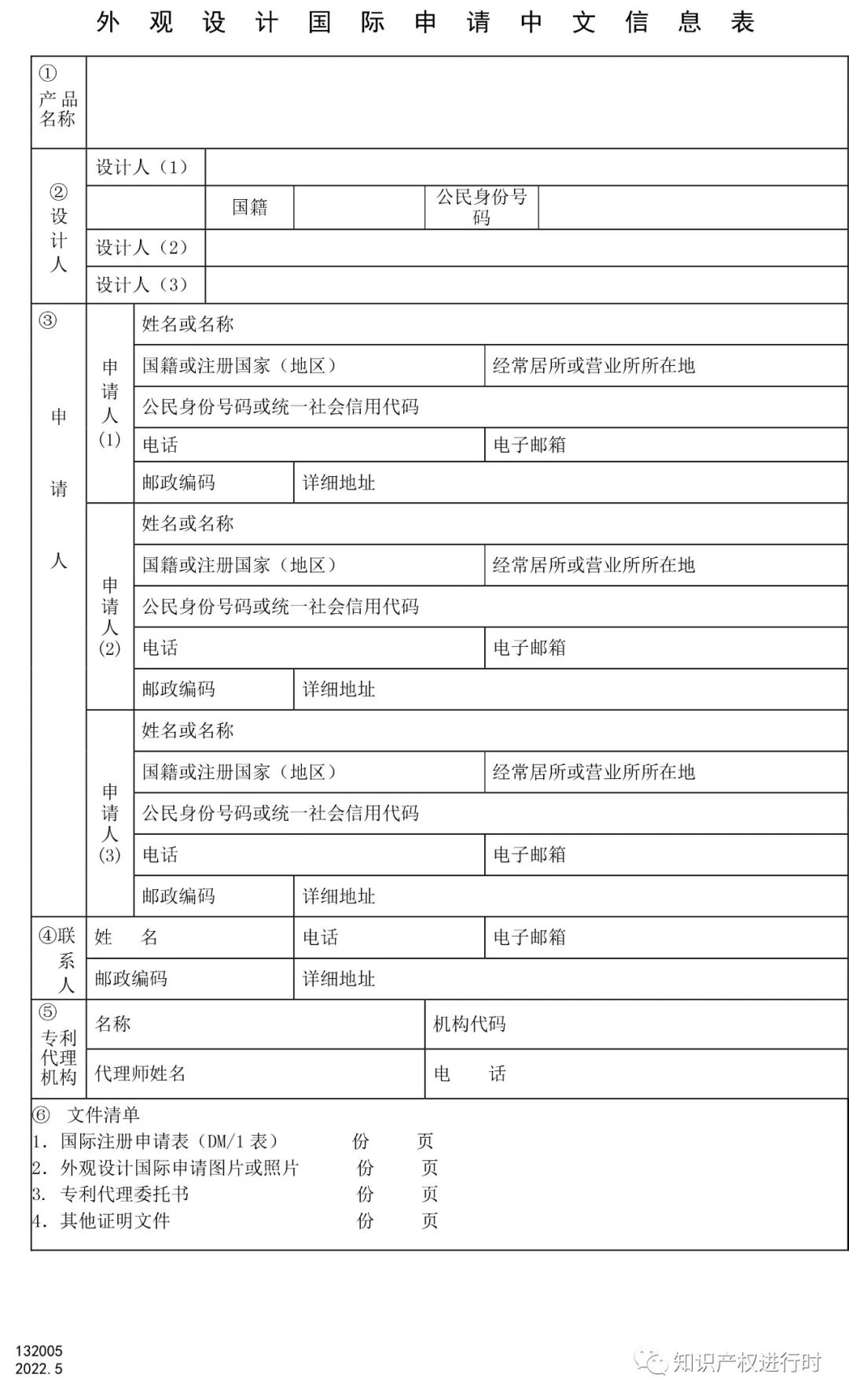 注:国际注册申请表(DM/1表)请访问世界知识产权组织网站(https://www.wipo.int/hague/en/forms/)下载。