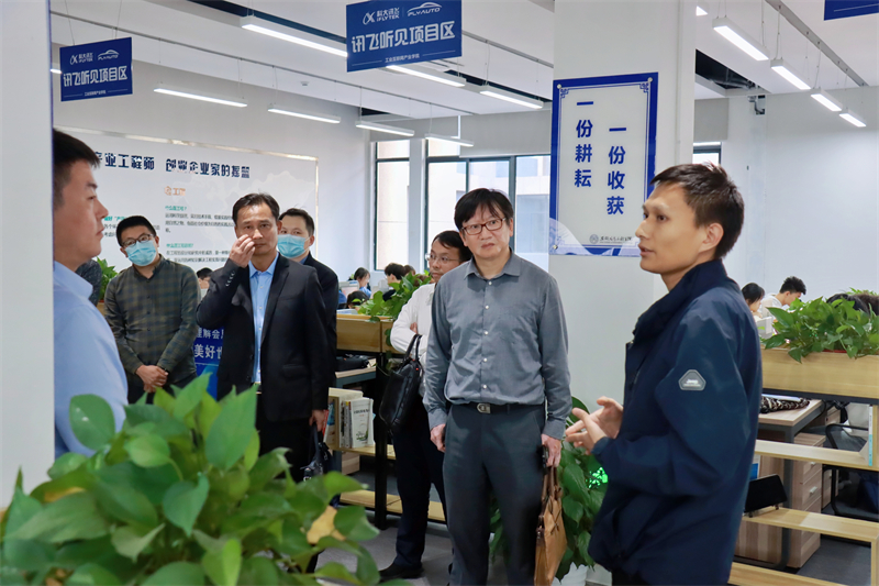 在综合工程实践中心,考察团走进课程实践课堂,正在上课的正是学校与埃泰克公司共建的产业学院班学生。授课教师、科大讯飞驻校工程师朱宁向考察团一行详细介绍了学校工业互联网产业学院教学进展情况及中长期教学愿景。
