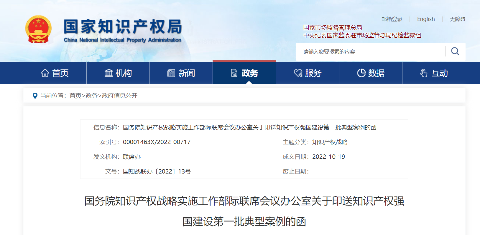 国务院,知识产权战略实施工作部际联席会议办公室:关于印送知识产权强国建设第一批典型案例的函