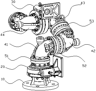 其次,要严谨描述技术细节。在撰写专利申请文件时,要注重技术细节的描述,确保技术方案的准确性和可信度。具体地,如下图所示:所述消防水炮炮体包括:进水底座10;第一蜗轮蜗杆组件20和第二蜗轮蜗杆组件30;多个弯管,所述多个弯管包括第一弯管41、第二弯管42、第三弯管43和第四弯管44;其中,所述第一蜗轮蜗杆组件20安装在所述进水底座10上,所述第一弯管41安装在所述第一蜗轮蜗杆组件20上,所述第一弯管41通过第一补偿管52与所述第二弯管42连接,所述第二弯管42所述第三弯管43连接,所述第三弯管43安装在所述第二蜗轮蜗杆组件30上,所述第二蜗轮蜗杆组件30与第四弯管44相连。