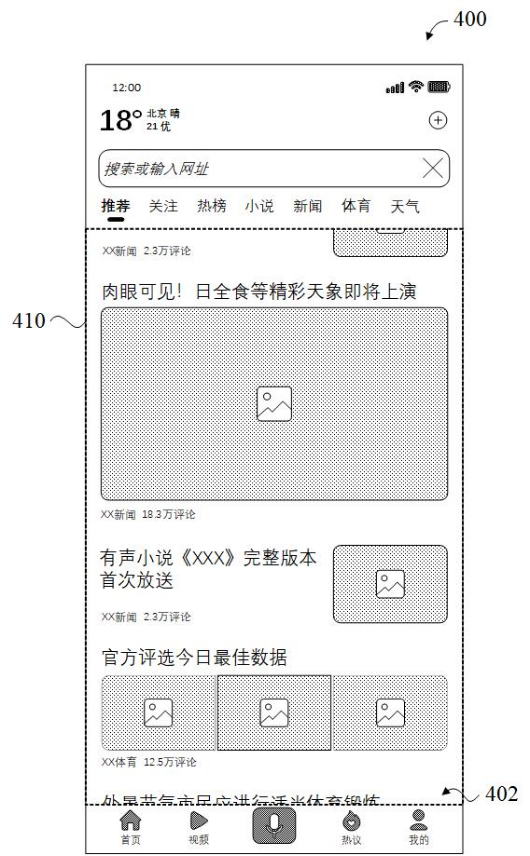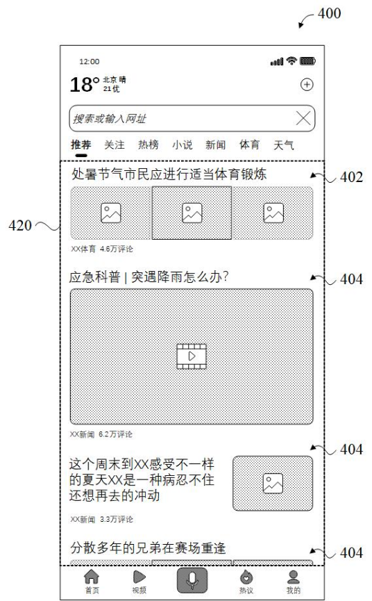 在撰写“显示信息流的方法、装置、设备和介质”专利申请的说明书的过程中,代理师详细描述了一系列丰富的实施例,每一个实施例均通过精细的文字描述和/或精确的制图来展现。这些实施例围绕核心技术—信息流界面的重现和接续显示—展开,描述了从高级概念到具体应用的不同层面。例如,专利附图中展示了用户界面的布局和接续显示的细节,这不仅包括了应用程序如何记录和恢复用户的最后阅读状态,还涉及如何接续显示更多的内容条目。如专利中的图4A和图4B所示,在终端设备上重现上次被切换至后台运行或关闭时所显示的第一页面410,页面底端具有未显示完全的内容条目402,而在接续显示的第二页面420,页面顶端显示有内容条目402,其下方显示有更多的内容条目404。